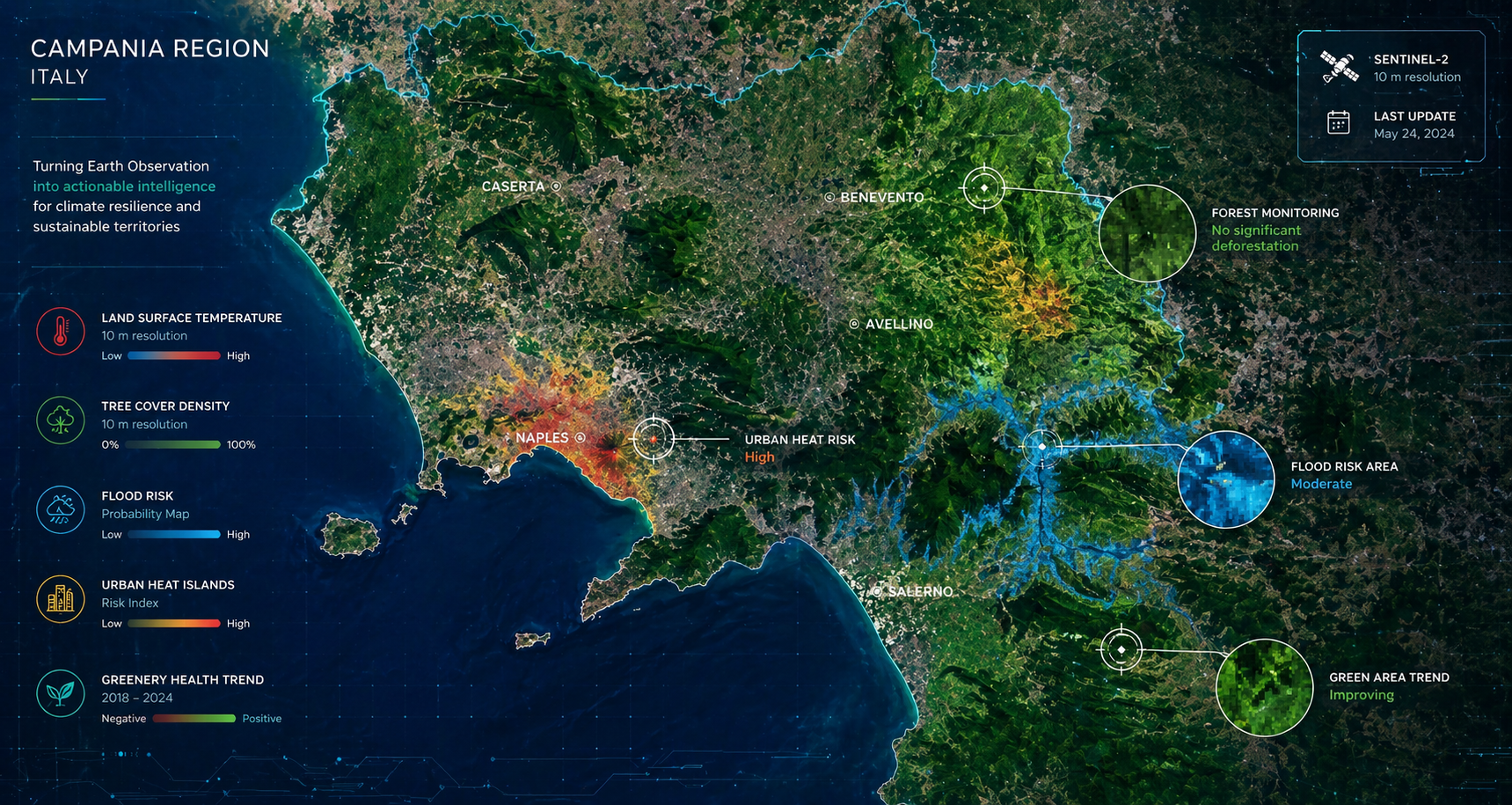 It is the ambition to build in Campania an International Competence Center for Earth Observation Downstream Services, able to attract investment, accelerate research and development, generate new ventures and position the region as a global reference point for Earth Intelligence technologies.